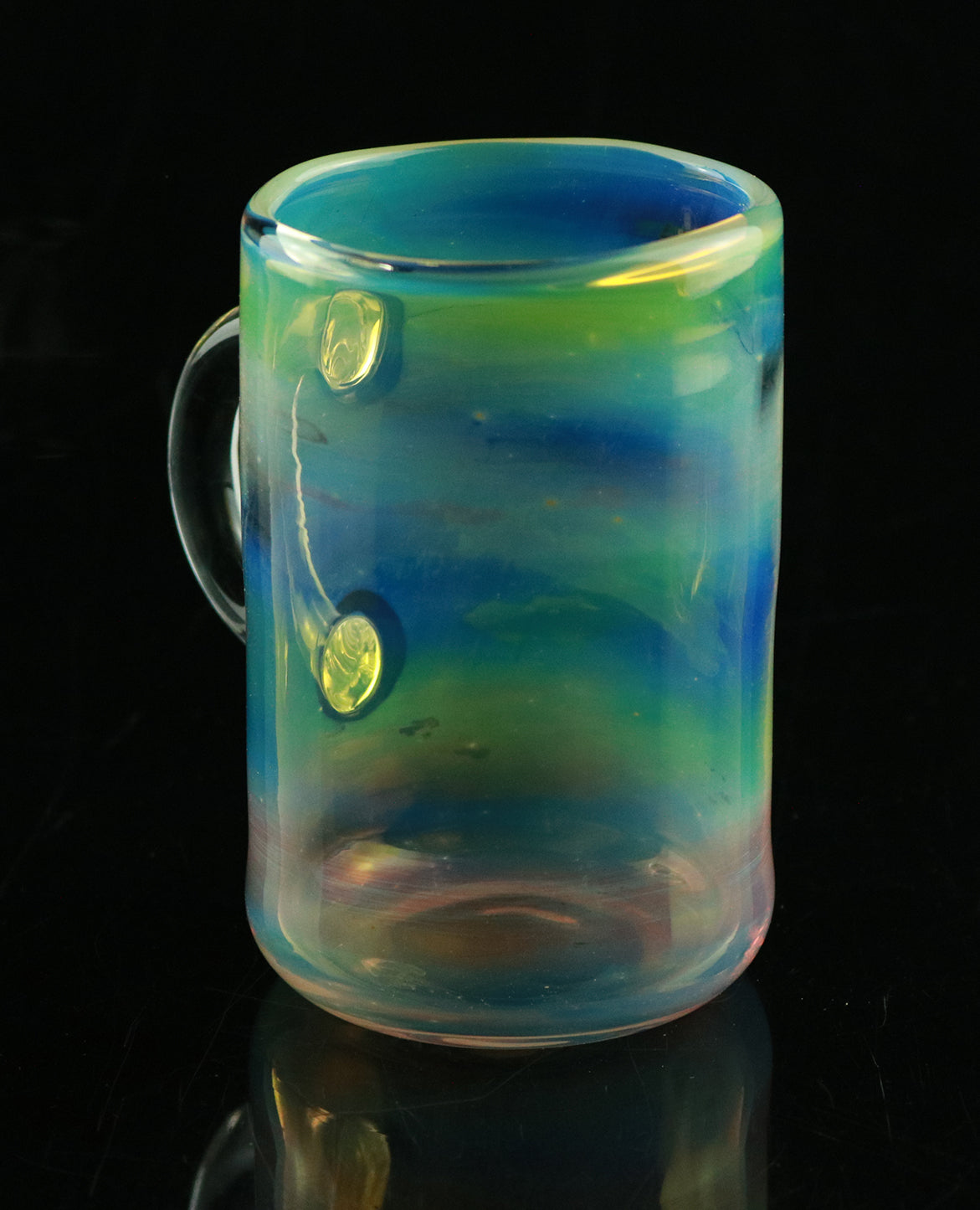 Ck glass made this 10oz coffee mug with clear handle. It stands 4" tall and has a 2.5" opening. Perfect for that 1st sip of the day.